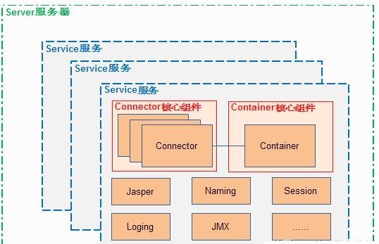 Tomcat 还有其它重要的组件,如安全组件 security、logger 日志组件、session、mbeans、naming 等其它组件。这些组件共同为 Connector 和 Container 提供必要的服务。