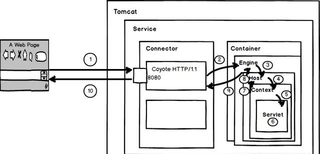 一个Connecter将在某个指定的端口上侦听客户请求,接收浏览器的发过来的 tcp 连接请求,创建一个 Request 和 Response 对象分别用于和请求端交换数据,然后会产生一个线程来处理这个请求并把产生的 Request 和 Response 对象传给处理Engine(Container中的一部分),从Engine出获得响应并返回客户。