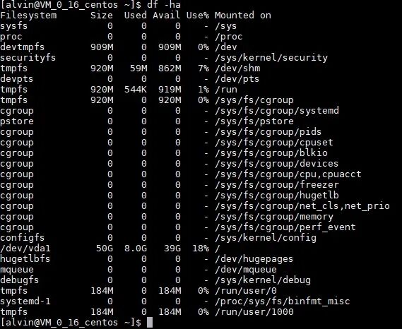 - df -a :显示完整磁盘使用情况,包括那些可用空间为 0 的磁盘区域。