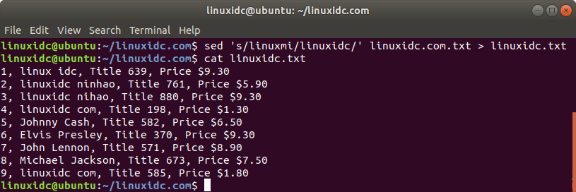 linuxidc@ubuntu:~/linuxidc.com$ cat linuxidc.txt 1, linux idc, Title 639, Price $8.88 2, linuxidc ninhao, Title 761, Price $5.90 3, linuxmi nihao, Title 880, Price $8.88 4, linuxmi com, Title 198, Price $1.30 5, Johnny Cash, Title 582, Price $6.50 6, Elvis Presley, Title 370, Price $8.88 7, John Lennon, Title 571, Price $8.90 8, Michael Jackson, Title 673, Price $7.50 9, linuxidc com, Title 585, Price $1.80