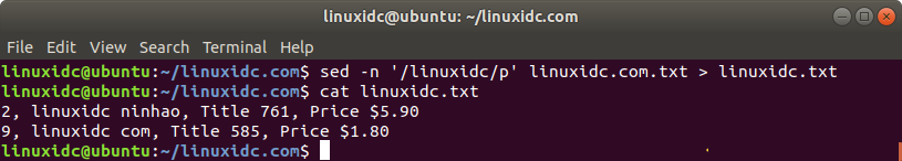linuxidc@ubuntu:~/linuxidc.com$ cat linuxidc.txt 2, linuxidc ninhao, Title 761, Price $5.90 9, linuxidc com, Title 585, Price $1.80