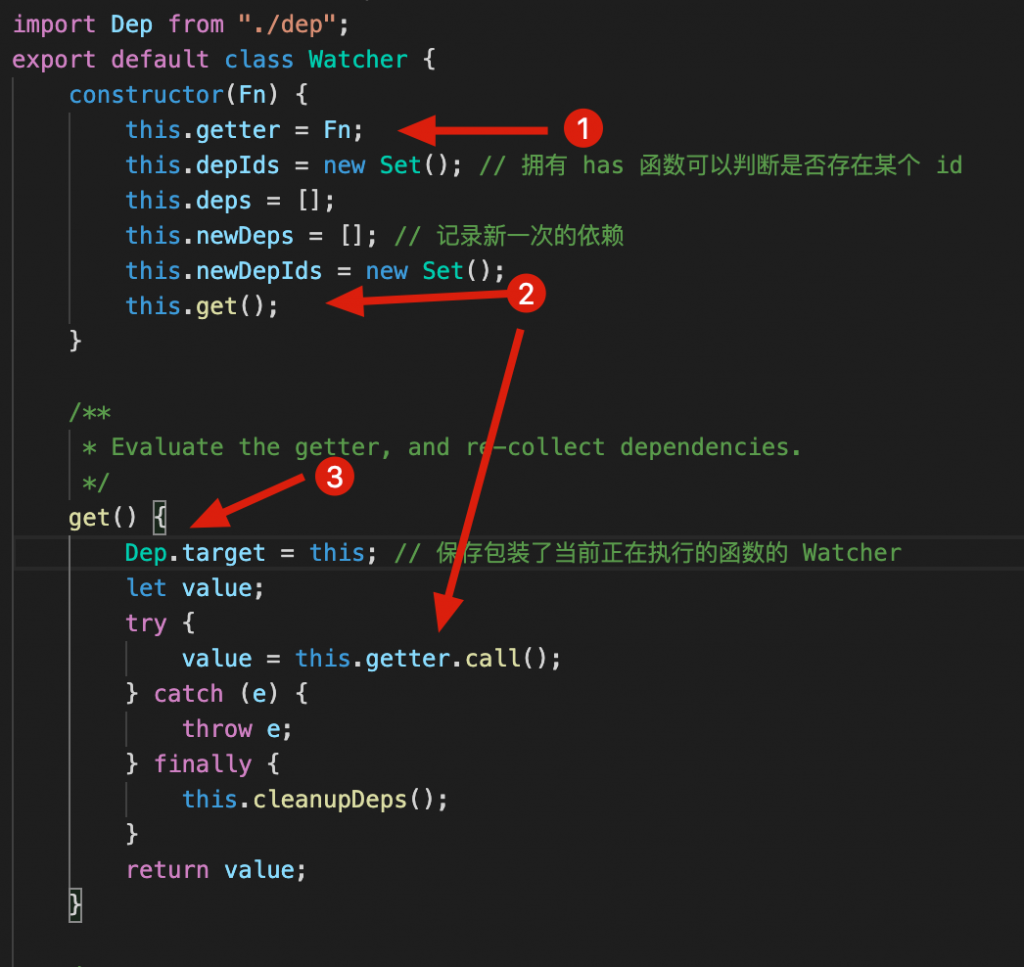 接下来执行 getter 函数的时候,如果读取了相应的属性就会触发 get ,从而将当前 Watcher 收集到该属性的 Dep 中。