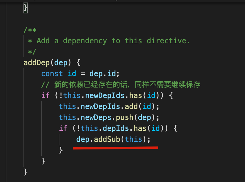 this.depIds = new Set(); // 拥有 has 函数可以判断是否存在某个 id