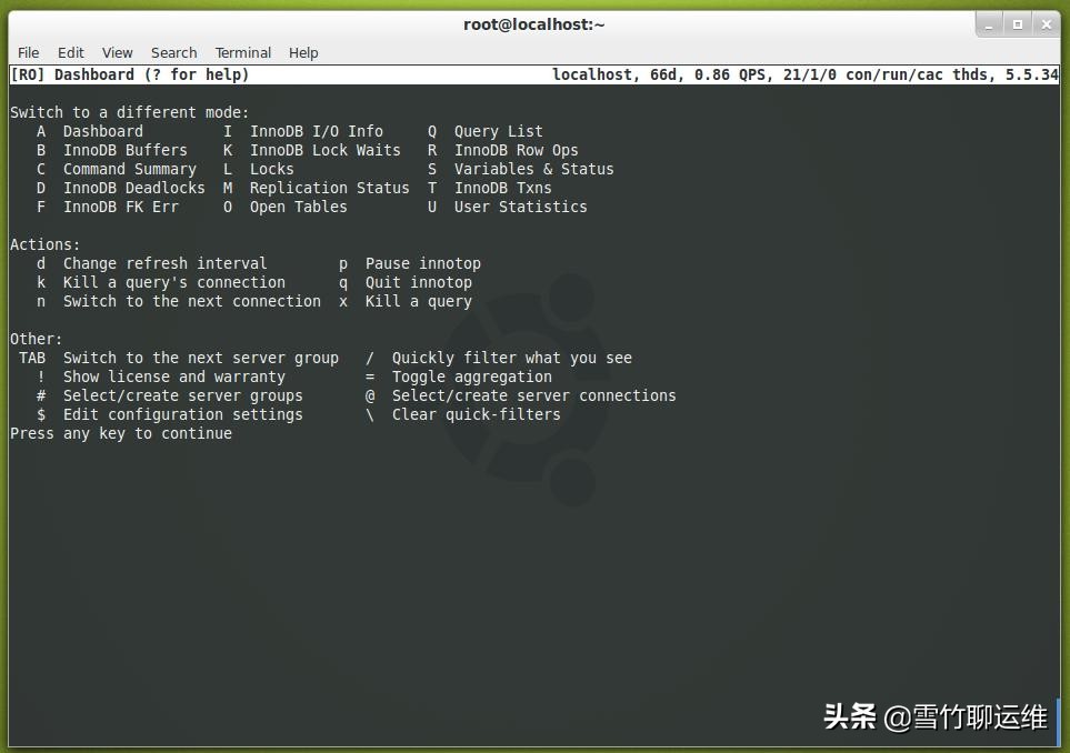 切换到不同的模式: A Dashboard I InnoDB I/O Info Q Query List B InnoDB Buffers K InnoDB Lock Waits R InnoDB Row Ops C 命令摘要 L Locks S Variables & Status D InnoDB Deadlocks M Replication Status T InnoDB Txns F InnoDB FK Err O 打开表 U 用户统计 操作: d 更改刷新间隔 p 暂停 innotop k 终止查询连接 q 退出 innotop n 切换到下一个连接 x 终止查询 其他: TAB 切换到下一个服务器组/快速过滤您看到的内容 !显示许可证和保修 = 切换聚合 # 选择/创建服务器组 @ 选择/创建服务器连接 $ 编辑配置设置 \ 清除快速过滤器 按任意键继续