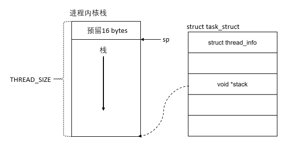 - void *stack:指向内核栈的指针,内核通过 dup_task_struct 为每个进程都分配内核栈空间,并记录在此。