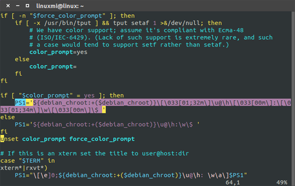 为了设置终端颜色,我们需要对~/.bashrc文件中的PS1变量进行定制。首先通过“vim ~/.bashrc“命令打开文件,找到PS1变量所在位置: