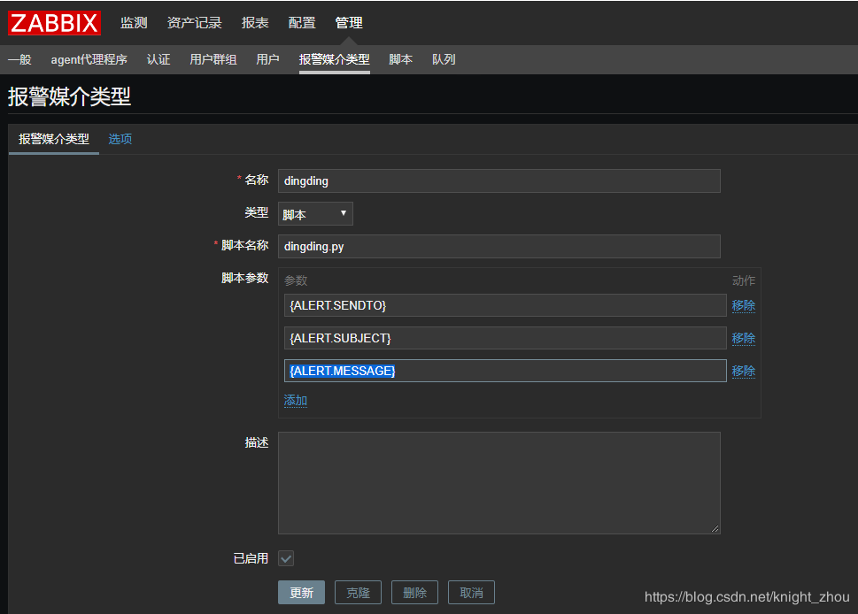 配置---> 报警媒介类型,脚本参数如下: