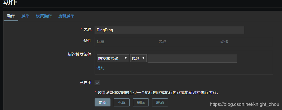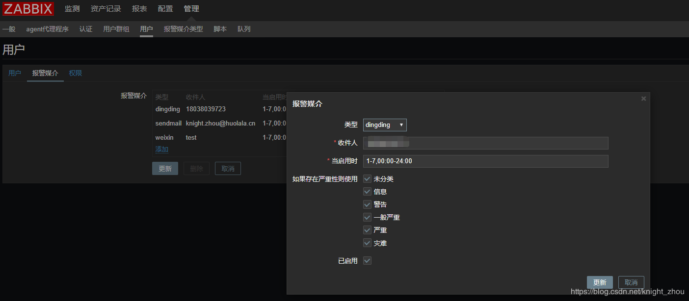 配置--->用户---> 报警媒介,把钉钉加进来即可。 其中收件人要写自己的电话号码。