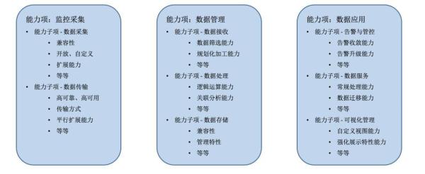 我们发现整个关于“监控管理”的能力项分成三个能力项,分别是“监控采集”、“数据管理” 和 “数据应用” 三个,能力项内又包括了相关的子能力项,我摘取一些我自己觉得很有代表性的点来进行分析: