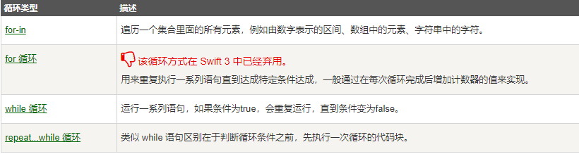 Swift 语言提供了以下几种循环类型。点击链接查看每个类型的详细描述: