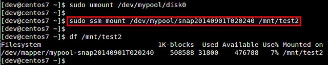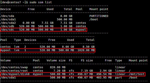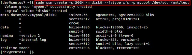 $?sudo?ssm?create?-s?500M?-n?disk0?--fstype?xfs?-p?mypool?/dev/sdc?/mnt/test