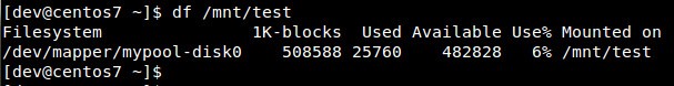 下面这个命令的作用是,创建一个名为mypool的存储池,创建存储池中名为disk0的500MB大小的LVM卷,使用XFS文件系统格式化卷,并将它挂载到/mnt/test下。立即就能领略到ssm的强大功能。