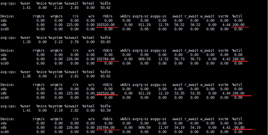 由上图可知,vdb磁盘的 %util【IO】几乎都在100%,原因是频繁的读取数据造成的。