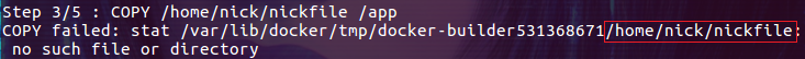 对于 COPY 和 ADD 命令来说,如果要把本地的文件拷贝到镜像中,那么本地的文件必须是在上下文目录中的文件。其实这一点很好解释,因为在执行 build 命令时,docker 客户端会把上下文中的所有文件发送给 docker daemon。考虑 docker 客户端和 docker daemon 不在同一台机器上的情况,build 命令只能从上下文中获取文件。如果我们在 Dockerfile 的 COPY 和 ADD 命令中引用了上下文中没有的文件,就会收到类似下面的错误: