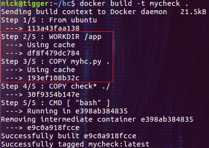 我们指定 /home/nick/hc 目录为 build 上下文,默认情况下 docker 会使用在上下文的根目录下找到的 Dockerfile 文件。