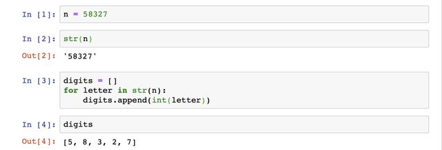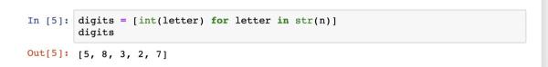 列表推导的一个非常酷的用例是将数字转换为它的单个数字列表。 技巧是将数字转换为字符串,遍历各个字符,将其转换为int并将它们存储在列表中。 我们可以按照所有步骤进行操作