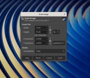 让我们假使我们需要缩小 Fedora 30 背景图像到它当前大小的 75%。为此,选择“图像Image?->?比例Scale”,然后在比例对话框上,在单位下拉列表中选择“百分比percentage”。接下来,输入 “75” 作为宽度或高度,然后按 Tab 键。默认情况下,其它尺寸将自动地调整大小,以相应地与更改的尺寸保持纵横比。现在,保存其它选项不变,并按比例。