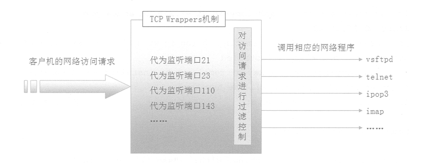 TCP Wrappers机制的保护对象为各种网络服务程序,针对访问服务的客户端地址进行访问控制。对应的两个策略文件为/etc/hosts.allow和/etc/hosts.deny,分别用来设置允许和拒绝的策略。