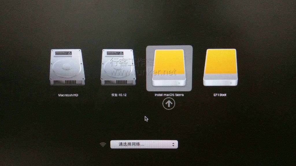 当U盘启动镜像安装完毕以后,插到Mac电脑上,一直按住Options键开机,直到出现Install macOS Sierra,键盘箭头键选择Install macOS Sierra进去安装,如下图所示。