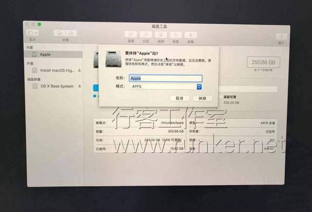 如果要把你电脑之前的数据需要清除(格式化),可进入【磁盘工具】,选择【apple】磁盘,点击上方按钮【抹掉】数据。