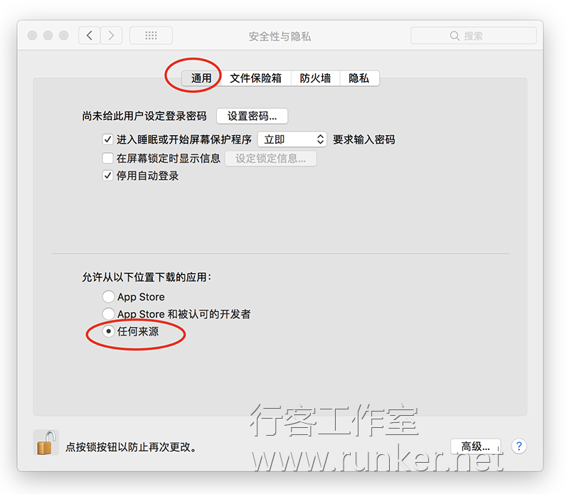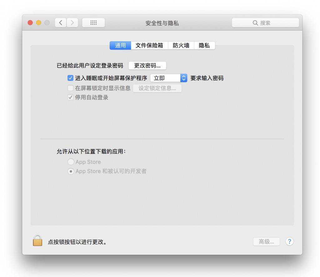 这时候我们再回到,安全隐私选项,这时候就可以看到有任何来源的选项了。点击左下角的解锁,就可以修改成任何来源选项了。