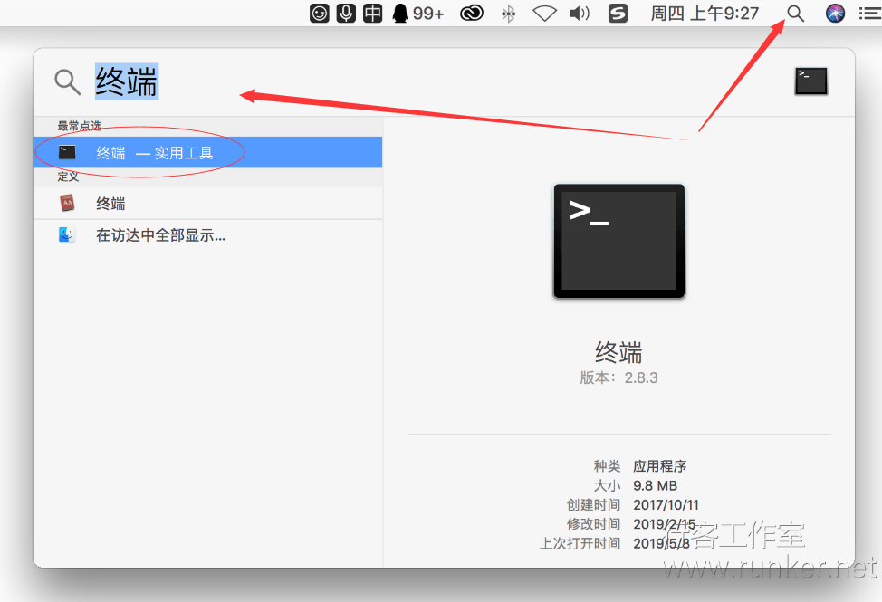 1、点击mac 电脑右上角的搜索,输入【终端】(终端就相当于windows命令)。