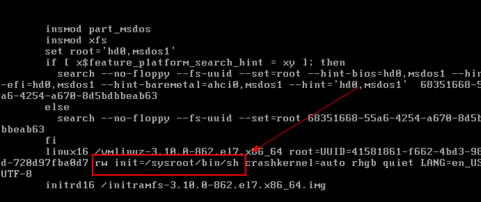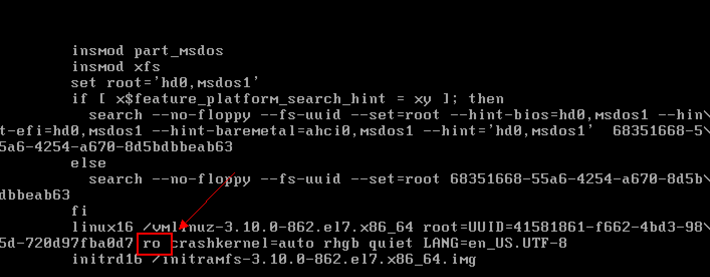 2.进入下图界面,修改ro为rw init=/sysroot/bin/sh