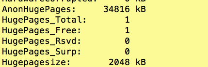 default_hugepagesz=1G hugepagesz=1G hugepages=1设置到/etc/default/grub中的GRUB_CMDLINE_LINUX中,然后运行update-grub更新启动参数配置文件 /boot/grub/grub.cfg。之后重新启动,cat /proc/meminfo就能看到系统中显示大页数量和剩余的数量(这个图是配置的2M的页)。