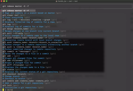 如上所示,navi 允许我们查阅所有的备忘录并执行对应的命令,值得注意的是,备忘录是实时匹配的,如果我键入 git,那么差不多就剩下 git 相关的命令行。