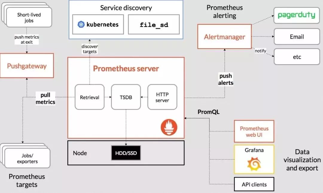 从图的左上角可以看到,对于一些定时任务模块,因为是周期性运行的,所以采用拉的方式无法获取数据,那么Prometheus也提供了一种推数据的方式,但是并不是推送到Prometheus Server中,而是中间搭建一个Pushgateway,定时任务模块将metrics信息推送到这个Pushgateway中,然后Prometheus Server再依然采用拉的方式从Pushgateway中获取数据。