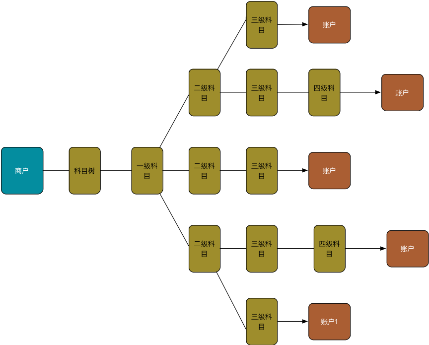 宜信支付结算账户系统采用科目树的概念,每个机构都会绑定一个科目树。科目树的根节点是一级科目,底层的科目下挂账户,结构如下: