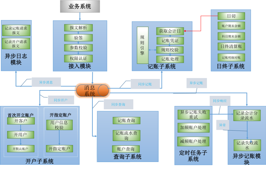 记账子系统:账户系统的核心模块,处理业务系统的记账请求。