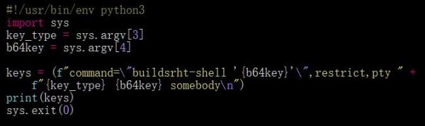 上面脚本中buildrht-shell命令告诉用户使用ssh builds@buildhost connect 之类的命令进行连接,可以使用SSH_ORIGINAL_COMMAND变量来获取其命令行: