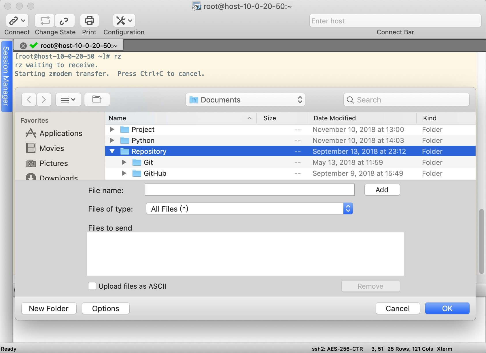 [root@host-10-0-20-50 ~]# rz rz waiting to receive. Starting zmodem transfer. Press Ctrl+C to cancel.