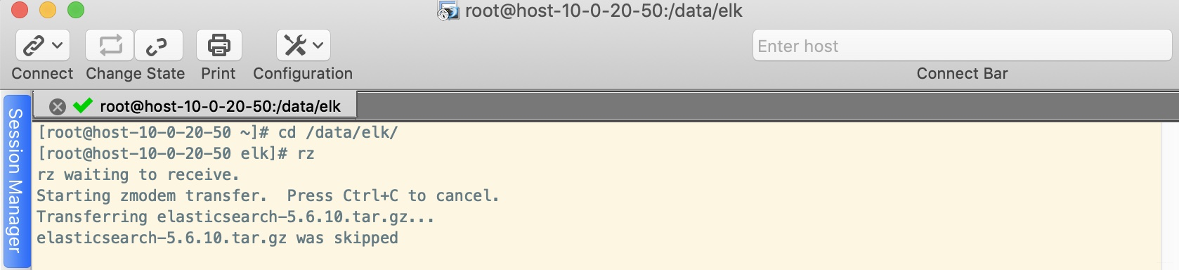[root@host-10-0-20-50 elk]# rz rz waiting to receive. Starting zmodem transfer. Press Ctrl+C to cancel. Transferring elasticsearch-5.6.10.tar.gz... elasticsearch-5.6.10.tar.gz was skipped
