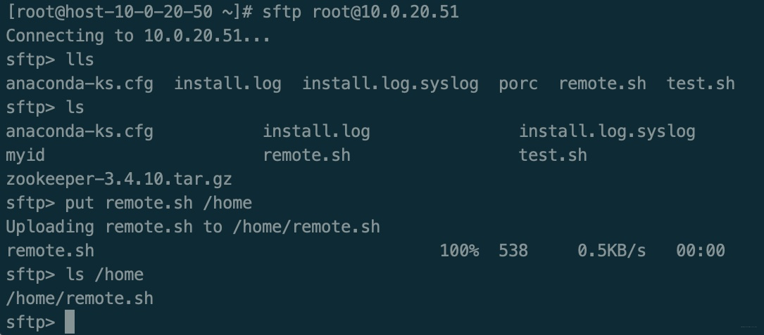 sftp> put remote.sh /home # 指定远端接收路径为/home Uploading remote.sh to /home/remote.sh remote.sh 100% 538 0.5KB/s 00:00 sftp> ls /home # 查看远端/home路径下的文件 /home/remote.sh
