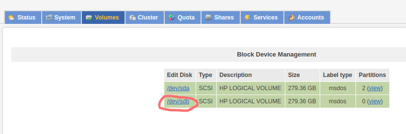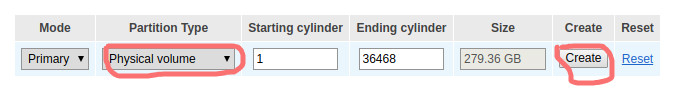 点击:Volumes >> "create new physical volumes" >> 选择需要创建pv的磁盘,这里是/dev/sdb