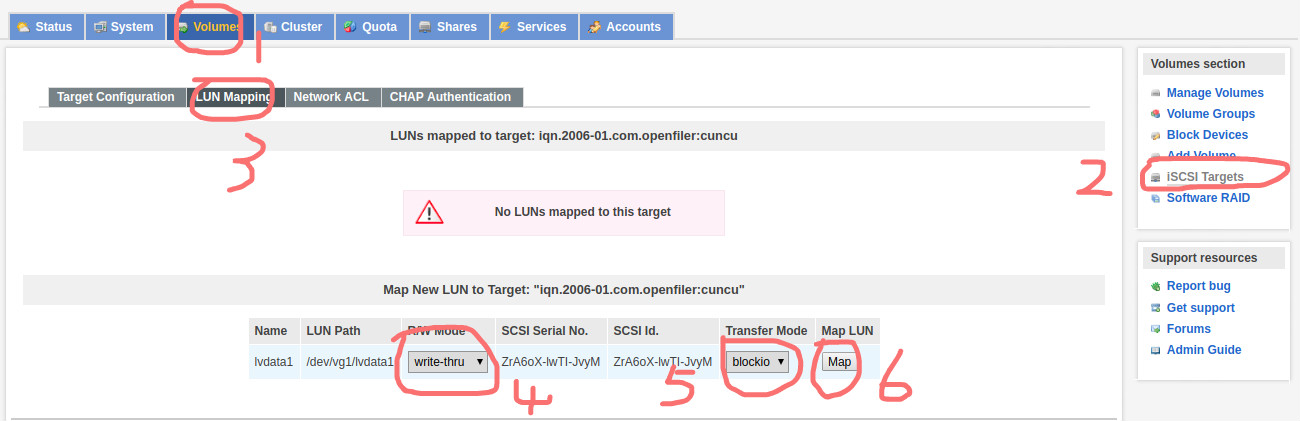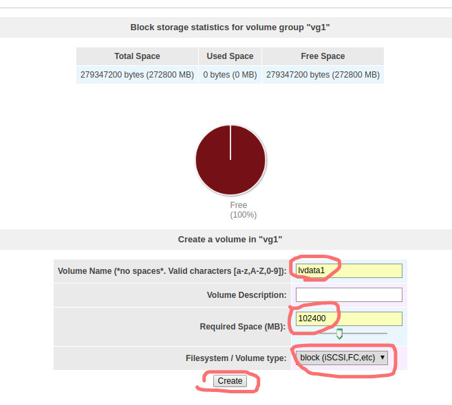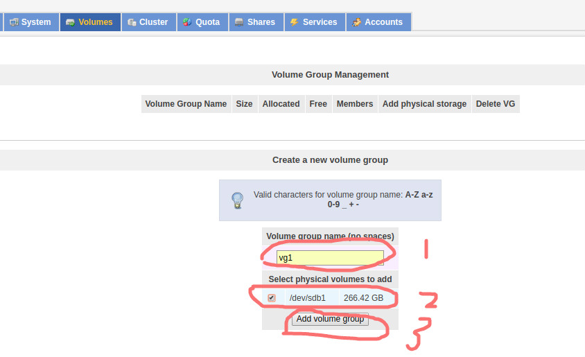 点击:Volumes >> "Volume Groups" >> 输入vg名,和需要应用的pv磁盘