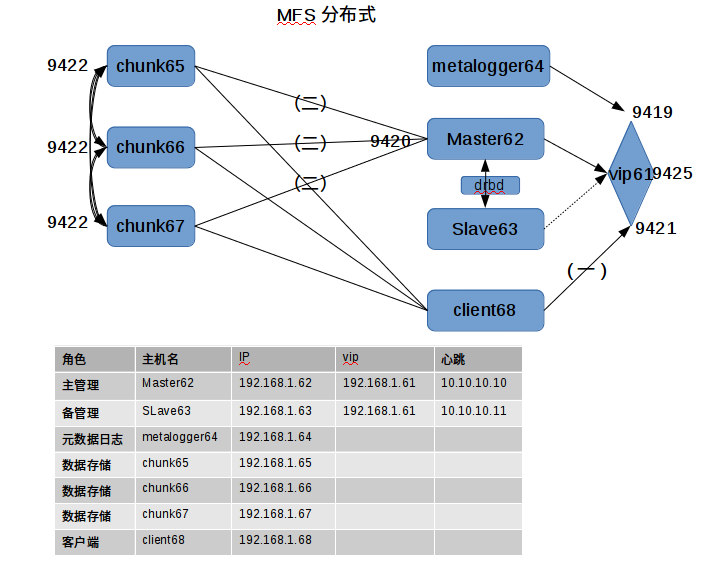 master主机上:drbd资源启动 >> drbd资源置主 >> 挂载drbd到指定目录 >> 启动mfsmaster和mfscgiser >> 启动keepalived掌管VIP slave备机上:drbd资源启动 >> drbd资源置从 >> 启动keepalived监测master主机是否故障