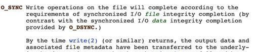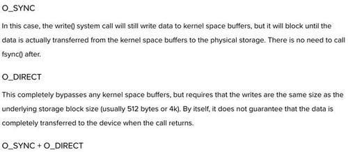 这里重点说一下O_DIRECT和O_SYNC,首先要明确的是,O_DIRECT只是说数据不会经过page cache(一般用在用户态自己管理buffer)而是直接提交给块设备层,但是不会同步等待数据安全写入磁盘之后才返回(比如数据可能还在块层排队或者在磁盘自己的cache中)。而O_SYNC标志,虽然数据还是会写page cache,但是此时会采用write through的策略,并同步等待数据安全写入磁盘后才会返回。因此如果同时使用O_DIRECT和O_SYNC,则表示数据不会经过page cache并同步等待数据安全写入磁盘才返回,当然这样IO的性能会非常低下。