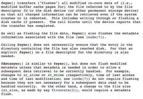 那么要怎么做呢?很多人会想到很多办法,比如:fflush()、fsync()、fdatasync()、sync()、open()使用O_DIRECT或O_SYNC标志等。嗯,这些手段(或者某些组合)的确可以保证数据安全的持久化,那么它们之间有什么区别呢?fflush()和fsync()有啥区别?O_DIRECT是啥意思,它可以保证数据安全的持久化吗?O_DIRECT和O_SYNC区别什么?O_SYNC和fsync()呢?fsync能完成msync的功能吗?本文将试图理解、解释这些概念的作用和区别。