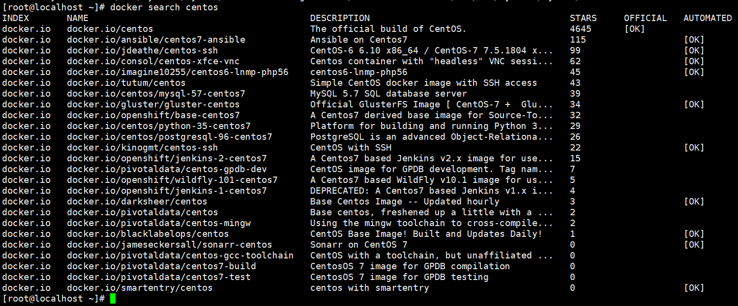 docker search //从Docker Hub搜索镜像 [root@localhost ~]# docker search centos
