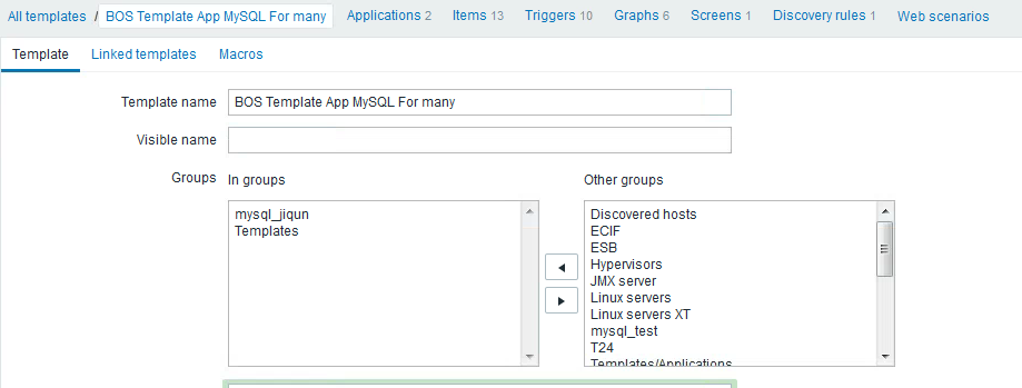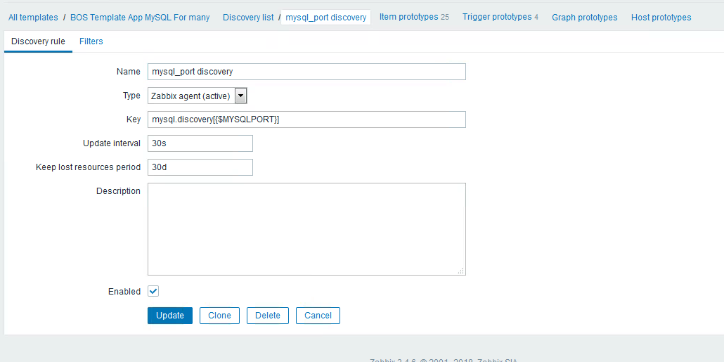 因为这个模板是 克隆 的默认 mysql监控模板,可以忽略 items,triggers。 监控项都在 Discovery rules 里。