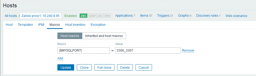 点开主机,添加主机宏,宏名称是 自动发现脚本里的 参数, 宏的值就是 此 主机上需要监控的端口。