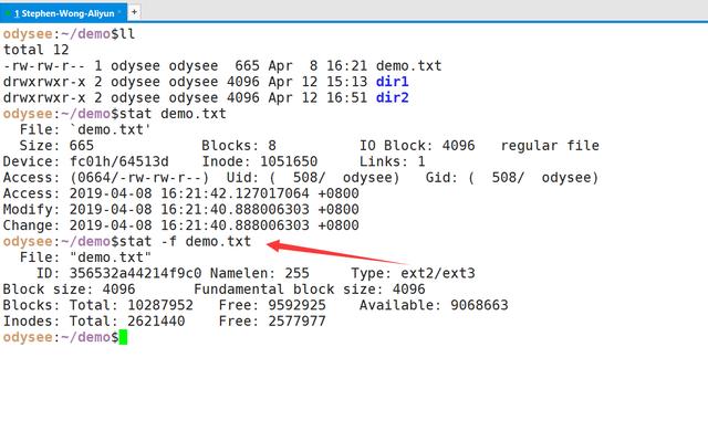 使用-f选项,不再是査看指定文件信息,而是査看文件所在文件系统的信息。