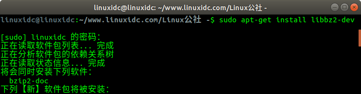 linuxidc@linuxidc:~/www.linuxidc.com/Linux公社 -$ sudo apt-get install libbz2-dev