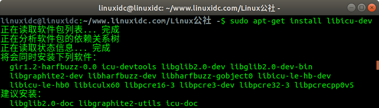 linuxidc@linuxidc:~/www.linuxidc.com/Linux公社 -$ sudo apt-get install libicu-dev 正在读取软件包列表... 完成 正在分析软件包的依赖关系树 正在读取状态信息... 完成 将会同时安装下列软件: gir1.2-harfbuzz-0.0 icu-devtools libglib2.0-dev libglib2.0-dev-bin libgraphite2-dev libharfbuzz-dev libharfbuzz-gobject0 libicu-le-hb-dev libicu-le-hb0 libiculx60 libpcre16-3 libpcre3-dev libpcre32-3 libpcrecpp0v5 建议安装: libglib2.0-doc libgraphite2-utils icu-doc 下列【新】软件包将被安装: gir1.2-harfbuzz-0.0 icu-devtools libglib2.0-dev libglib2.0-dev-bin libgraphite2-dev libharfbuzz-dev libharfbuzz-gobject0 libicu-dev libicu-le-hb-dev libicu-le-hb0 libiculx60 libpcre16-3 libpcre3-dev libpcre32-3 libpcrecpp0v5 升级了 0 个软件包,新安装了 15 个软件包,要卸载 0 个软件包,有 218 个软件包未被升级。 需要下载 11.8 MB 的归档。 解压缩后会消耗 57.4 MB 的额外空间。 您希望继续执行吗? [Y/n] Y