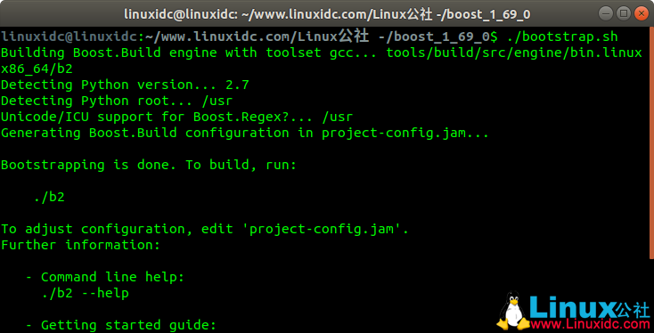 linuxidc@linuxidc:~/www.linuxidc.com/Linux公社 -/boost_1_69_0$ ./bootstrap.sh