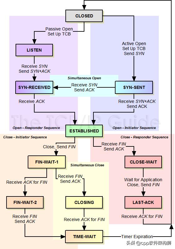 关于TCP这个协议的细节,我还是推荐你去看W.Richard Stevens的《TCP/IP 详解 卷1:协议》(当然,你也可以去读一下RFC793以及后面N多的RFC)。另外,本文我会使用英文术语,这样方便你通过这些英文关键词来查找相关的技术文档。