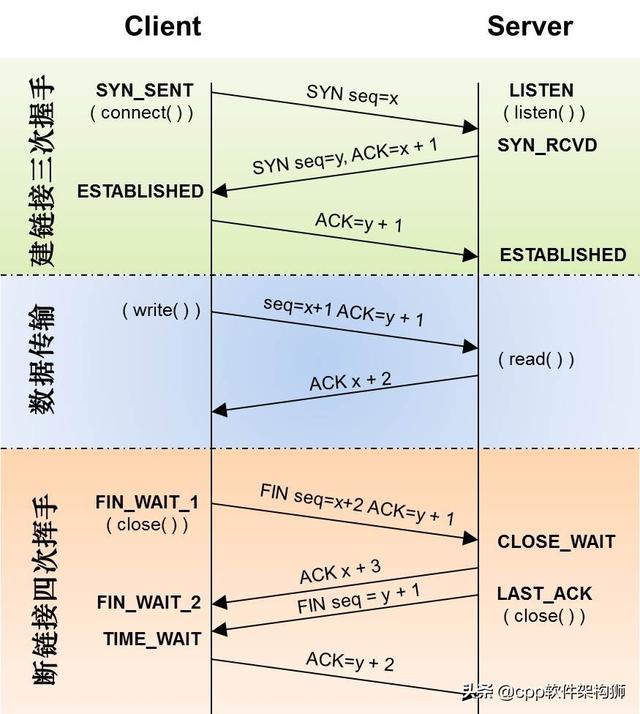 对于建链接的3次握手,主要是要初始化Sequence Number 的初始值。通信的双方要互相通知对方自己的初始化的Sequence Number(缩写为ISN:Inital Sequence Number)——所以叫SYN,全称Synchronize Sequence Numbers。也就上图中的 x 和 y。这个号要作为以后的数据通信的序号,以保证应用层接收到的数据不会因为网络上的传输的问题而乱序(TCP会用这个序号来拼接数据)。